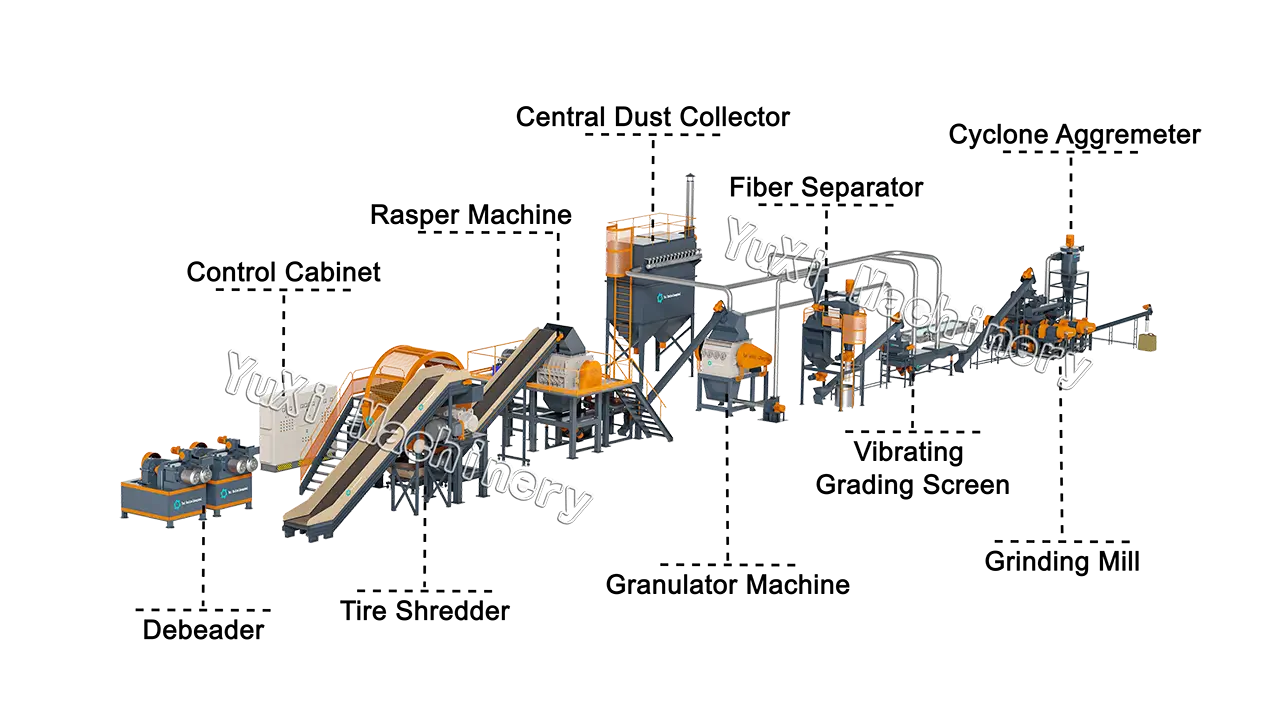 Rubber powder is a high-value-added recycled material obtained through deep processing of waste tires. It is a fine powder product further ground from rubber particles, with a particle size range typically between 20 mesh and 200 mesh. Compared with rubber particles, rubber powder has a larger specific surface area and better compatibility, and can be more widely applied in the modification of rubber products, building materials, polymer composite materials, and other fields.